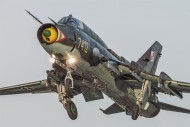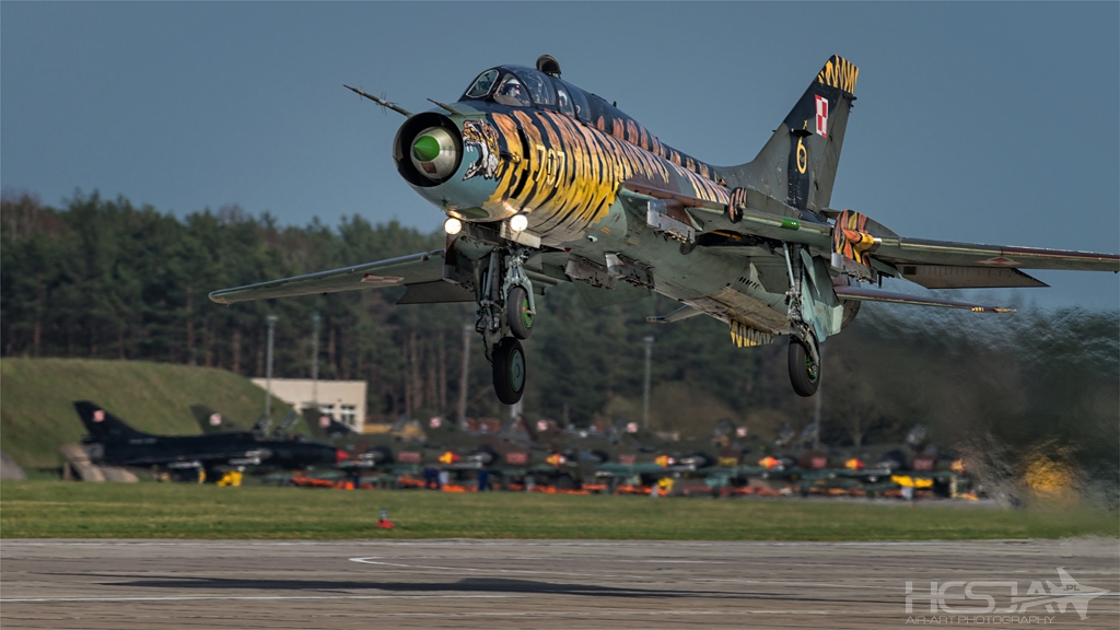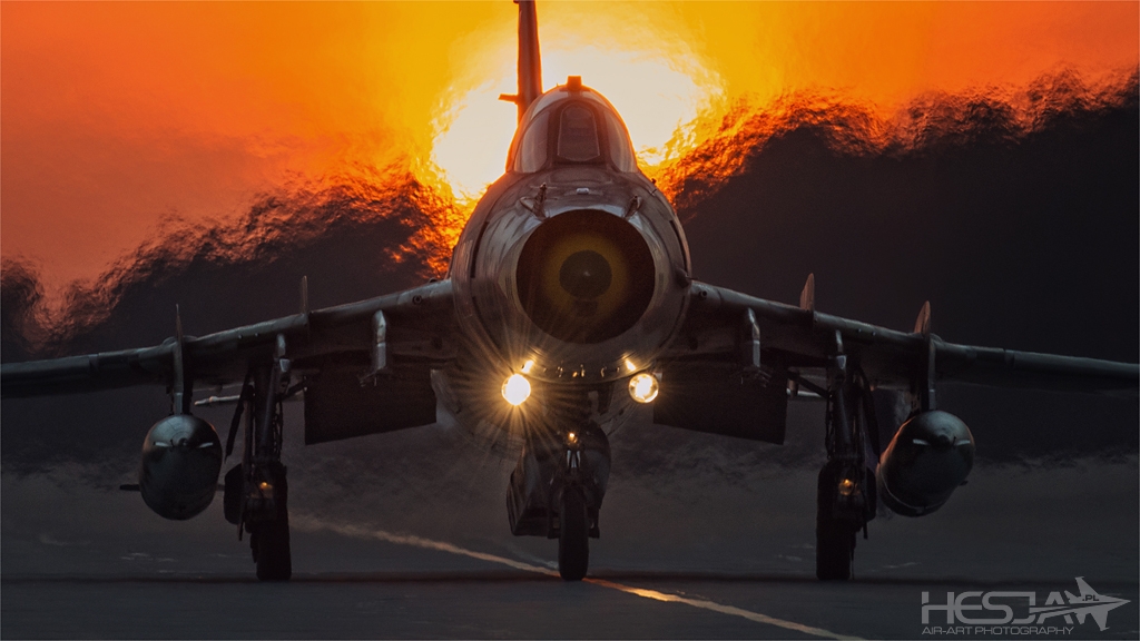 Korzystając z kapitalnego światełka i pięknej wiosennej pogody, wyruszyliśmy tym razem w podróż sentymentalną do Świdwina. Sentymentalną, bo w tej bazie kiedyś pracowałem przez prawie rok i bardzo dobrze poznałem jej różne miejscówki – również fotograficzne. Plan był taki, by skorzystać z wyjątkowego położenia słońca względem elementów lotniska i zrobić zdjęcia samolotów Su-22 kołujących na nocne loty właśnie z zachodzącym słoneczkiem w tle. Pogoda od rana była rewelacyjna. Wizytę w bazie rozpoczęliśmy od rozmowy z dowódcą i wręczenia mu kilku naszych zdjęć z poprzednich odwiedzin. Następnie pojechaliśmy na lotnisko. Nie omieszkałem odwiedzić kolegów na eskadrze technicznej. Byli prawie wszyscy, na których mi zależało! Co za spotkanie! Nie widzieliśmy się prawie 20 lat! Nie było jednak dużo czasu na plotki gdyż z daleka dobiegał naszych uszu znajomy ryk silników Su-22. Po uzgodnieniach na wieży ruszyliśmy na foto-łowy po drugiej stronie pasa. Może Su-22 nie ma już zbyt dużo walorów bojowych, ale dla mnie to wyjątkowo cudowna i fotogeniczna maszyna! Start na dopalaczu widziany z bezpośredniej bliskości robi niesamowite wrażenie! Suczki jedna za drugą a to szły w górę, a to lądowały. Z każdą minutą słońce było coraz niżej nad horyzontem, rozlewając swoje ciepłe światło, w którym pławiły się nasze piękne, acz hałaśliwe modelki. Tuż przed zachodem przemieściliśmy się na miejscówkę, z której lata temu kręciłem film podczas nocnych lotów. I tym razem było tam cudownie. Kołujące Su-22 z włączonymi światłami a w tle ognisty zachód słońca to coś co sprawia, że serce bije zupełnie inaczej! Po kołowaniu starty wprost w czerwień zachodniego nieba – masakra! :)