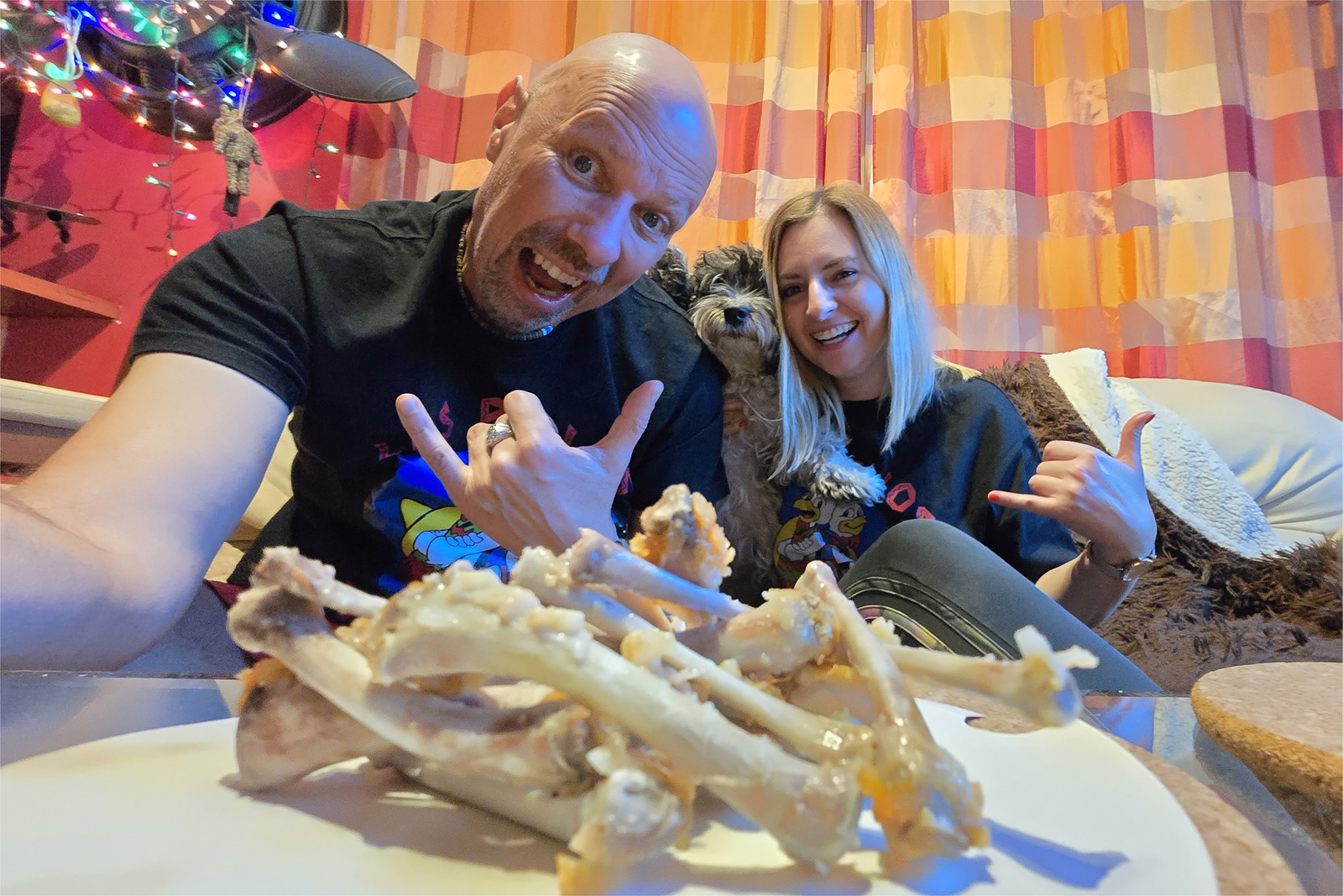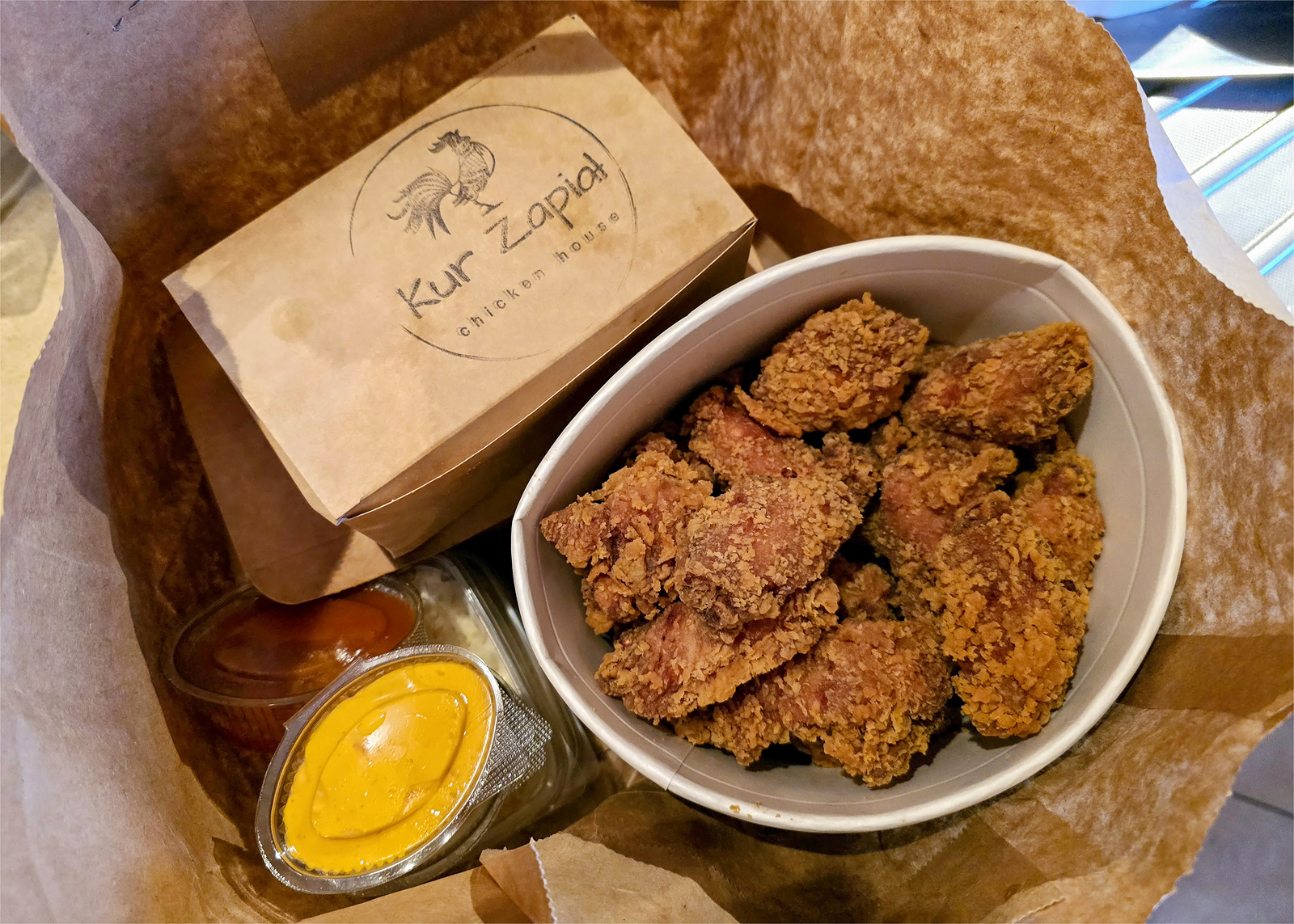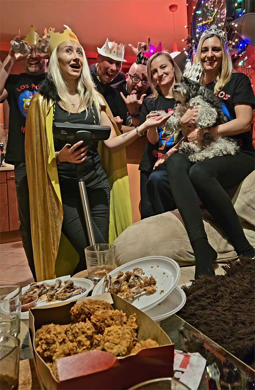 Skończyłem wykład i miałem ochotę zjeść coś niezdrowego i oczywiście się napić z przyjaciółmi. Byli Wujowie i Maciej Strzelczyk. Pojechaliśmy do mnie. Asia zamówiła stos kurczaków z knajpy Kur Zapiał. Zaraz po tym jak kurier zostawił paczkę zadziała się przedziwna rzecz. Rzuciliśmy się na te kurczaki jakby jutra miało nie być i jakbyśmy nie jedli od miesiąca. Przez jakieś 20 minut nikt do nikogo się nie odzywał tylko jadł! A tam jadł, zeżerał, pochłaniał i dzikim wzrokiem omiatał współtowarzyszy biesiady, żeby mu żaden z nich nie zabrał najlepszych kąsków :)